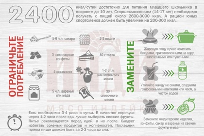 При составлении рациона важно учитывать пищевую ценность продуктов и затраты энергии вашего ребенка. Младшему школьнику в возрасте до 10 лет будет достаточно 2400 ккал в сутки, а старшеклассникам (14-17 лет) в зависимости от пола, необходимо уже 2300 – 3000 ккал. Если ученик ведет активный образ жизни и увлекается спортом, калорийность рациона должна быть увеличена на 200-300 ккал.
