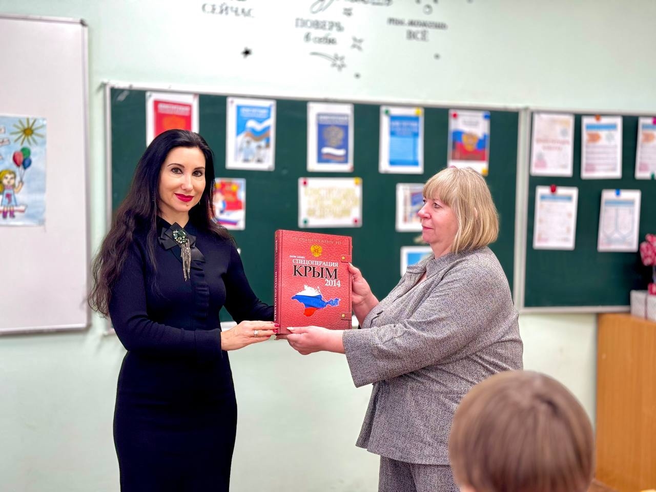 Оксана Геннадьевна поздравила учащихся и педагогический коллектив нашей школы с наступающим Днём Республики Крым и вручила подарочное издание, посвящённое «Крымской весне», а также пожелала всем мирного неба, согласия, единства и благополучия.